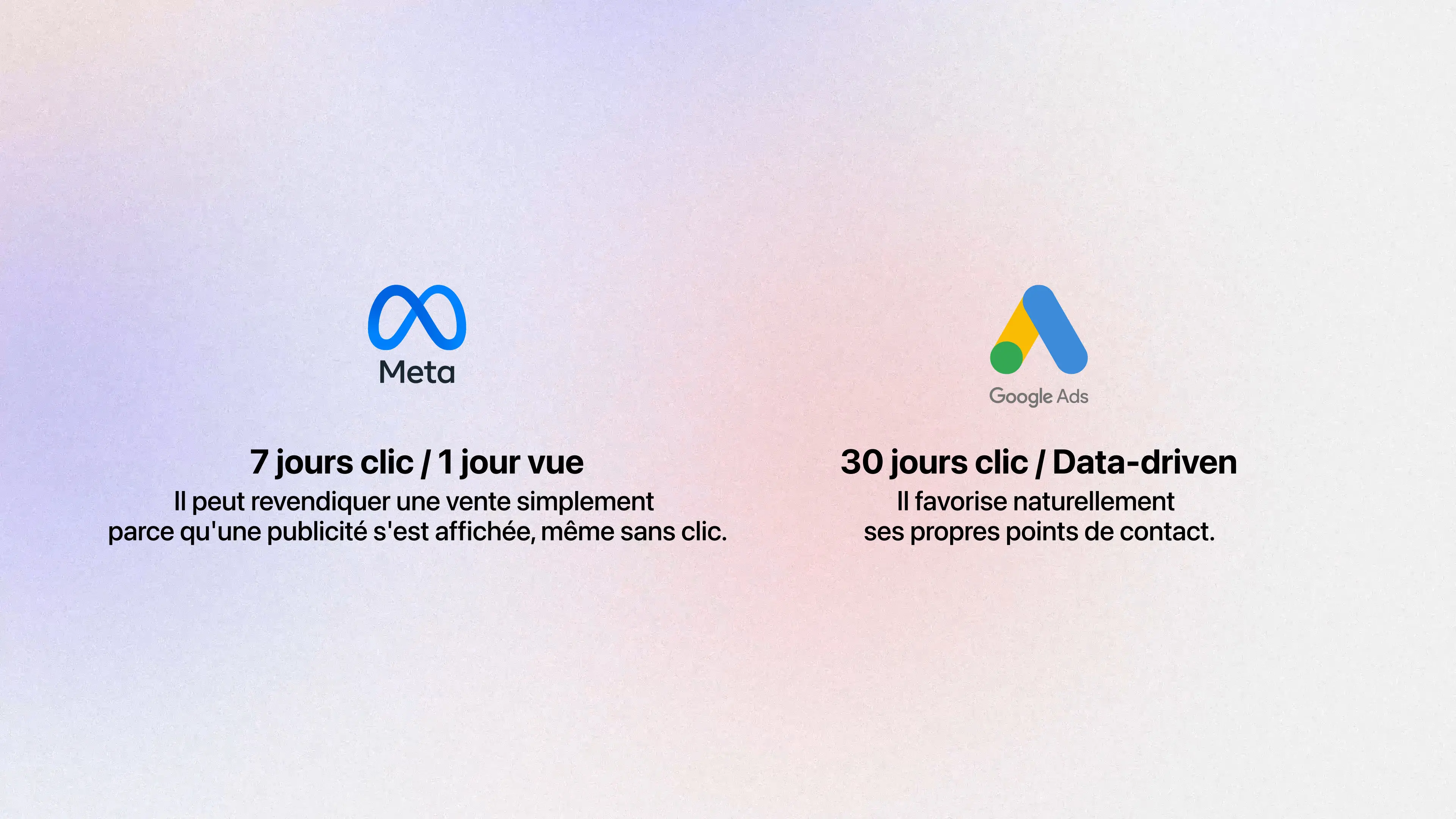 D'un côté, Meta Ads fonctionne sur une logique d'influence (Click + View). La plateforme considère qu'elle a contribué à la vente si une publicité a été vue ou cliquée jusqu'à 7 jours avant l'achat. Elle s'attribue le mérite d'avoir initié le désir.De l'autre, Google Ads et GA4 favorisent historiquement une logique de conclusion (Last Click ou Data-Driven). Ils s'attribuent le mérite d'avoir transformé l'essai au moment de la recherche finale.