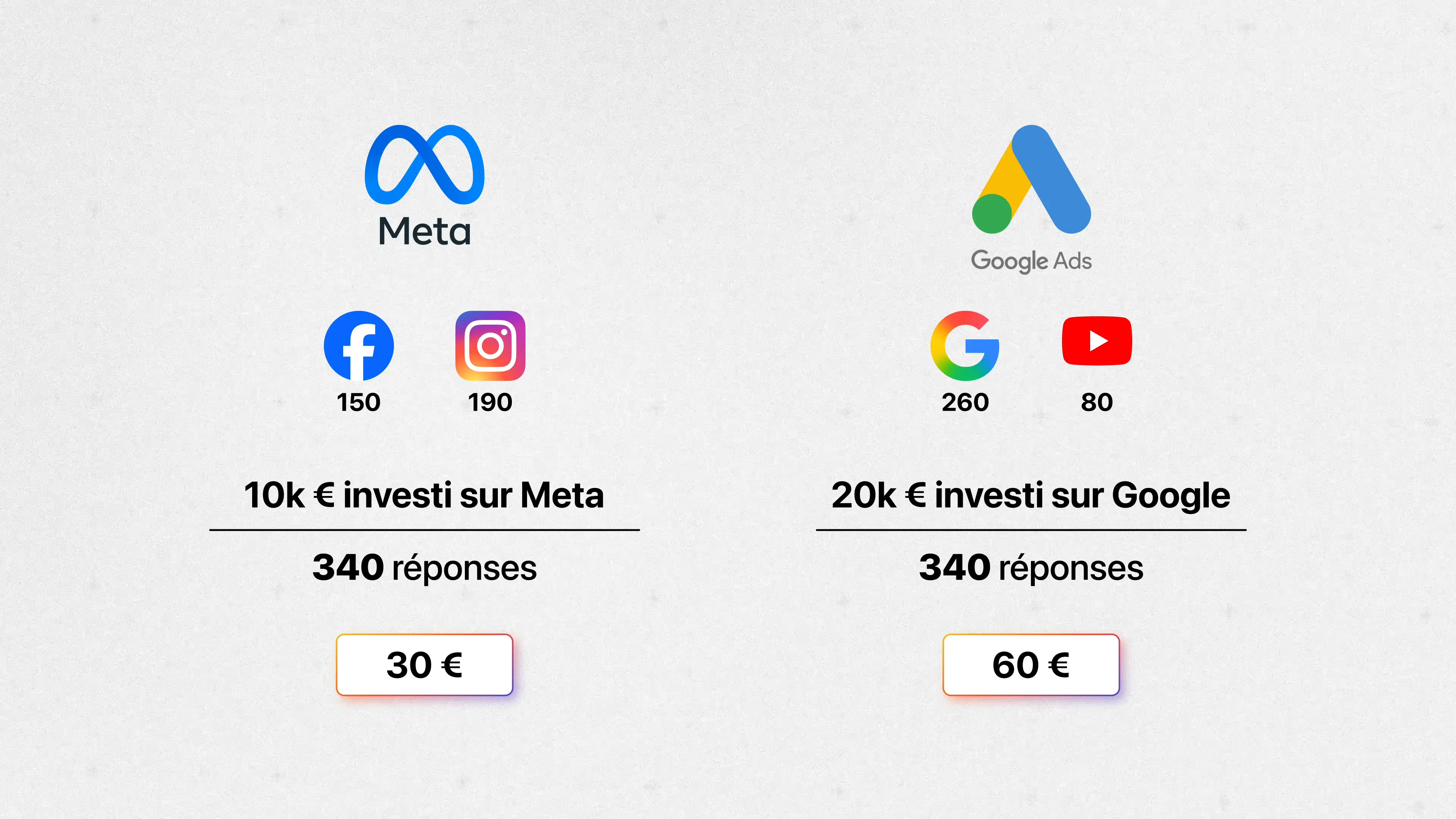 En croisant ces données budgétaires avec les réponses du sondage, le calcul final révèle une vérité économique bien différente de celle des Ads Managers. Le Coût d'Acquisition Déclaratif sur Meta tombe à environ 30 €, alors que celui sur Google grimpe à 60 €.
